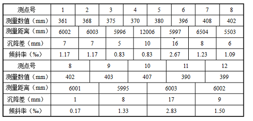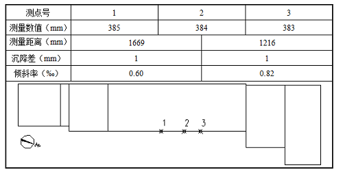 由检测结果可以得出,厂房各点沉降无明显规律,基础局部最大倾斜率为2.83‰,小于《建筑地基基础设计规范》(GB50007-2011)关于同类建筑基础局部倾斜的限值3‰;办公用房各点沉降差较小,基础局部最大倾斜率为0.82‰,小于《建筑地基基础设计规范》(GB50007-2011)关于同类建筑基础局部倾斜的限值3‰。(由于沉降观测包含施工误差,此数据仅作参考)