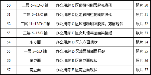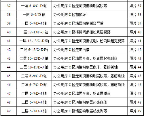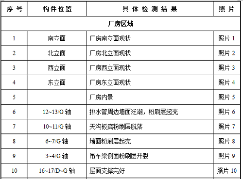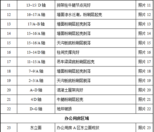 (4)现场对受检房屋主体结构及结构构件进行了外观损伤检测。经检测,厂房主要损伤有墙面泛潮,粉刷层起壳剥落,地坪破损等;办公用房主要损伤有墙面、顶棚粉刷层起壳剥落,露筋锈蚀等。