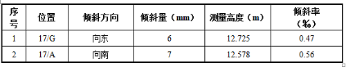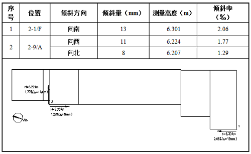 由检测结果可以得出,厂房最大倾斜率为0.56‰,未超出《危险房屋鉴定标准》JGJ125-1999(2004版)中规定的房屋整体倾斜限值10‰;办公用房最大倾斜率为2.06‰,未超出《危险房屋鉴定标准》JGJ125-1999(2004版)中规定的房屋整体倾斜限值10‰。(测量结果包括房屋实际倾斜度和施工误差影响)