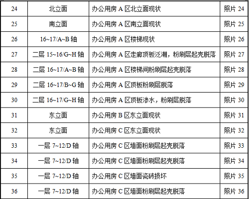 (4)现场对受检房屋主体结构及结构构件进行了外观损伤检测。经检测,厂房主要损伤有墙面泛潮,粉刷层起壳剥落,地坪破损等;办公用房主要损伤有墙面、顶棚粉刷层起壳剥落,露筋锈蚀等。