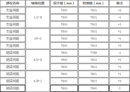 (1)主要轴线尺寸的检测与复核。采用手持式激光测距仪对网架主要轴线间距进行抽查与复核。检测结果如表6.1所示。