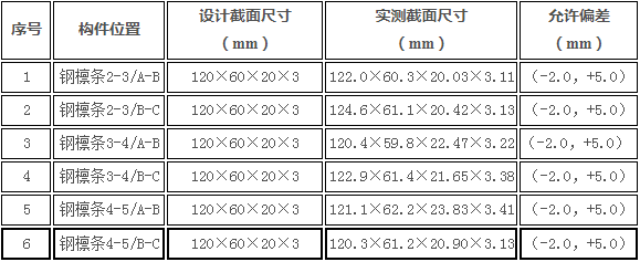 按照《钢结构工程施工质量验收规范》(GB50205-2001)表C.0.8,钢檩条截面尺寸的允许偏差为(-2.0mm~+5.0mm)。检测结果表明,网架屋面钢檩条截面尺寸的偏差在《钢结构工程施工质量验收规范》(GB50205-2001)允许偏差范围之内,网架屋面钢檩条截面尺寸与原设计图纸相符。