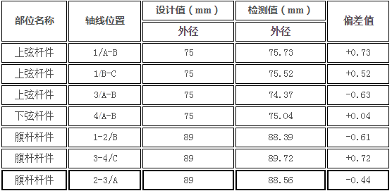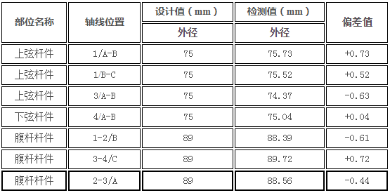按照《无缝钢管尺寸、外形、重量及允许偏差》(GB/T17395-2008)相关规定,热轧管外径<50mm时,允许偏为±0.50mm,热轧管外径>50mm时,允许偏差为外径的±1%。检测结果表明,网架屋面杆件截面尺寸的偏差在《无缝钢管尺寸、外形、重量及允许偏差》(GB/T17395-2008)允许偏差范围之内,网架屋面杆件截面尺寸与原设计图纸相符。