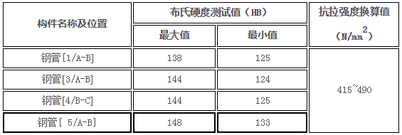 根据网架屋面结构的现场实际情况,采用布氏硬度计,参照《金属布氏硬度试验第1部分:试验方法》(GB/T231.1-2009)和《黑色金属硬度及强度换算值》(GB/T1172-1999)进行钢结构构件强度抽样检测。现场试样材质为Q235B,经检测钢管抗拉强度约为415N/mm2~490N/mm2,钢管强度满足Q235B钢的要求,安全验算时取原设计强度值。检测结果见表6.6。