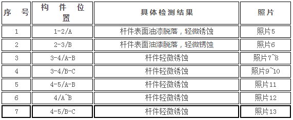 现场对网架结构进行了完损检测,发现钢杆件普遍存在表面油漆脱落,轻微锈蚀的现象。典型检测结果见表6-7。