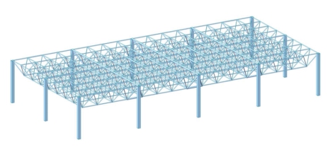本工程采用MidasGen结构设计软件对该网架屋面结构进行验算,按实测结构布置及构件截面尺寸进行建模计算。该网架计算模型见图6.1。