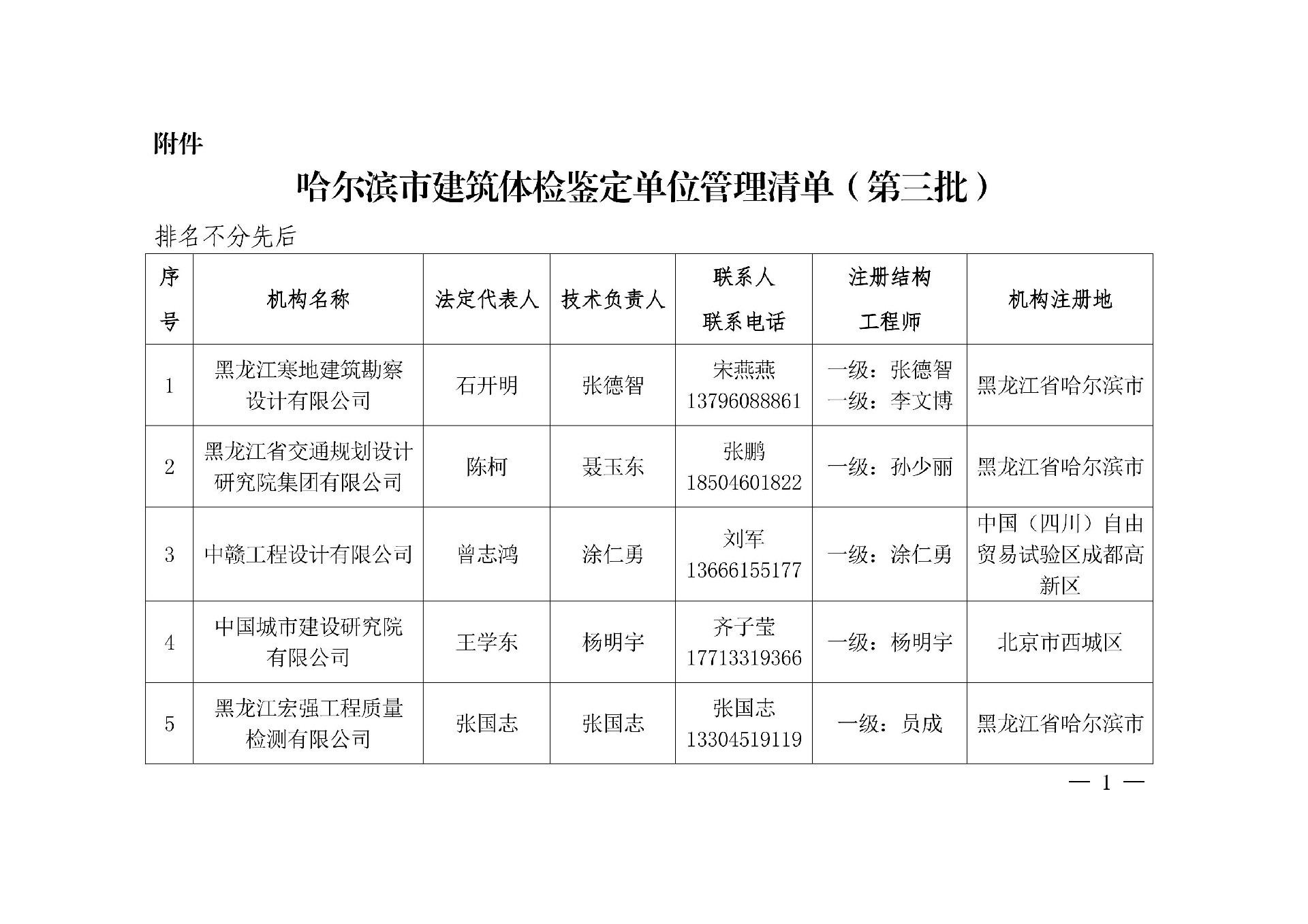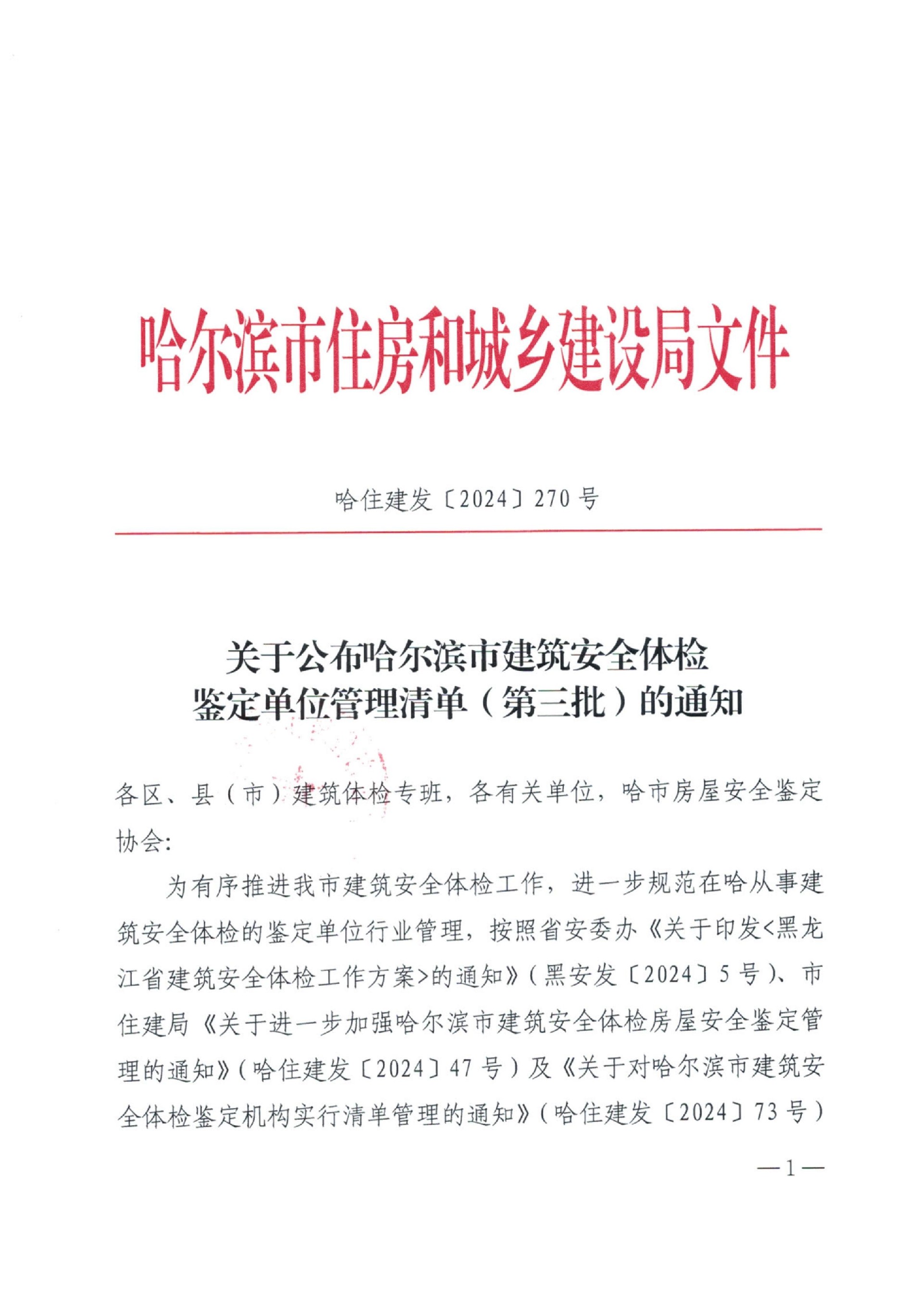 为有序推进我市建筑安全体检工作,进一步规范在哈从事建筑安全体检的鉴定单位行业管理,按照省安委办《关于印发<黑龙江省建筑安全体检工作方案>的通知》(黑安发〔2024〕5号)、市住建局《关于进一步加强哈尔滨市建筑安全体检房屋安全鉴定管理的通知》(哈住建发〔2024〕47号)及《关于对哈尔滨市建筑安全体检鉴定机构实行清单管理的通知》(哈住建发〔2024〕73号)有关要求,依鉴定单位主动申请,市住建局对提交申请鉴定单位进行材料申报审核与现场抽核,确定将21家鉴定机构列入哈尔滨市建筑体检鉴定单位管理清单(第三批),现予以公布。